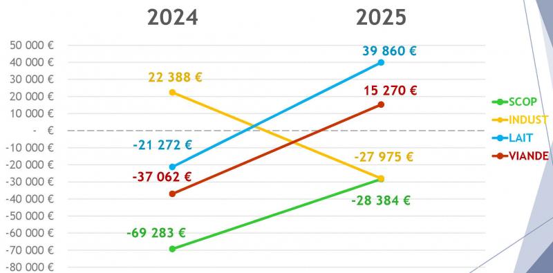 Premier constat, quel que soit le système de production, les charges opérationnelles sont à la baisse (engrais - 8 %, produits phytosanitaires -15 % ; aliments - 10 %), tandis que les charges de structures restent relativement stables. Des évolutions importantes des marges brutes par activités sont néanmoins à signaler. «Des conditions météorologiques plus favorables en 2025 ont permis de meilleurs rendements en blé. Même avec une offre mondiale abondante et une demande qui stagne, entraînant une baisse du prix à la tonne (175 €/t), la marge brute sur le blé bondit de 30 %», explique Jeanne Bayart, conseillère entreprise AS60.