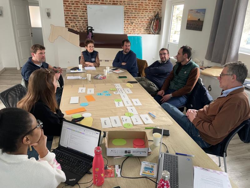 Autour de la table, un petit groupe d’agriculteurs comprenant notamment de jeunes irrigants a travaillé, avec les ingénieurs du projet, à définir une ferme fictive représentative du territoire.