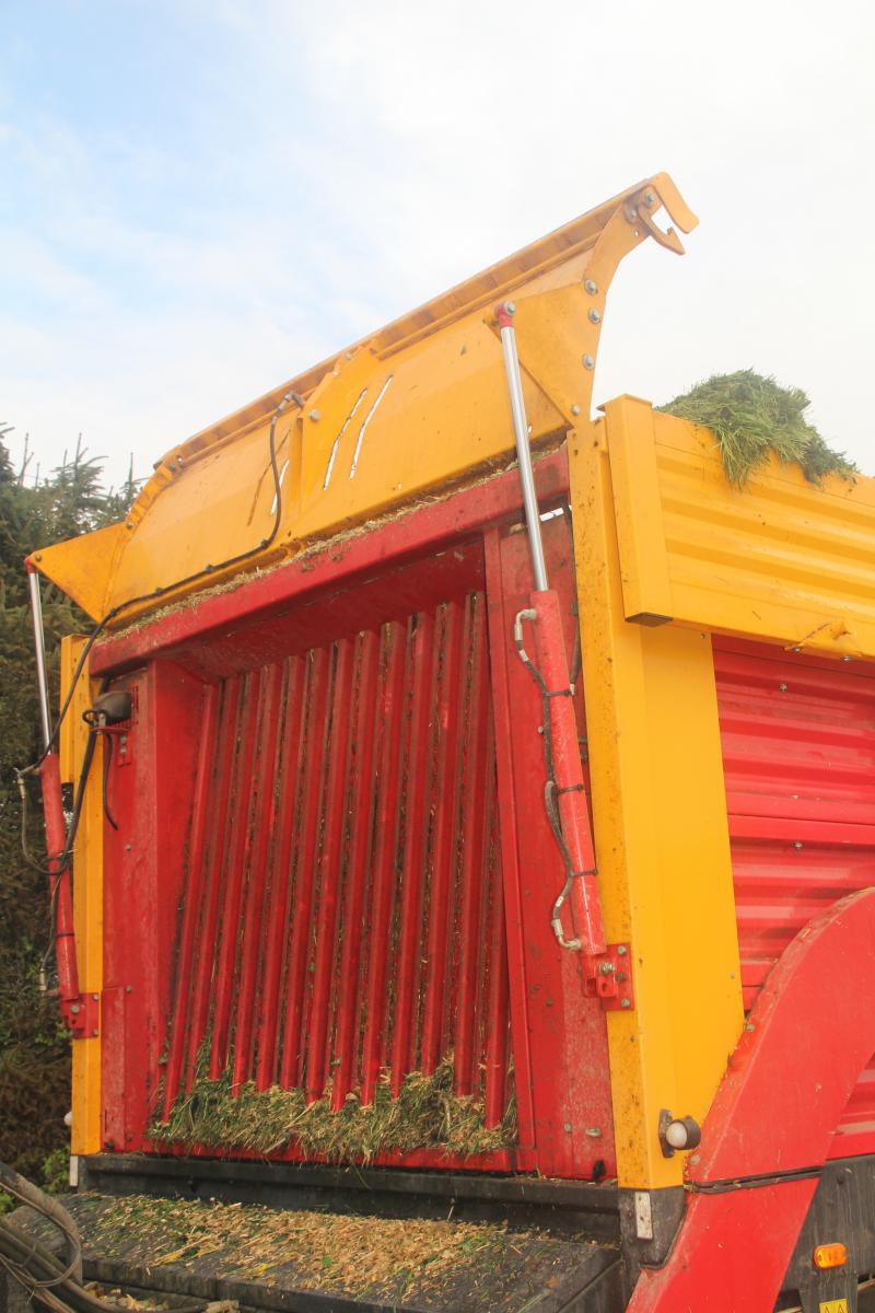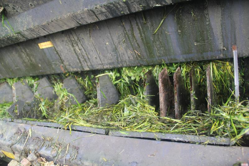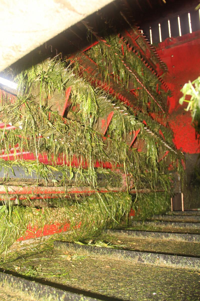 « Il suffit d’être rigoureux dans la répartition des différentes couches sur toute la longueur de caisse avec le télescopique. Les trois démêleurs sont suffisamment agressifs et rapprochés, et leur vitesse élevée, pour faire un mélange de qualité. Les betteraves, qui représentent jusqu’à 2,8 tonnes en hiver, sont en partie découpées, preuve de l’efficacité des démêleurs. » Cette fonc- tion de mélangeuse distributrice n’est possible que par la présence d’un dispo- sitif de pesée intégré à l’autochargeuse. « Je connais précisément la quantité d’herbe coupée et celle des aliments ajoutés au télescopique. C’est aussi un sérieux avantage pour calculer mon stock d’ensilage d’herbe, de paille et estimer le rendement des parcelles ». En cette fin avril, la caisse de 27 m3 (sans les rehausses) contient les onze tonnes de ration, dont huit d’herbe. « Je n’utilise pas les rehausses pour la distribution, car il manque cinq centimètres pour passer l’entrée du bâtiment. Elles sont remontées en dix minutes pour l’ensilage d’herbe ».